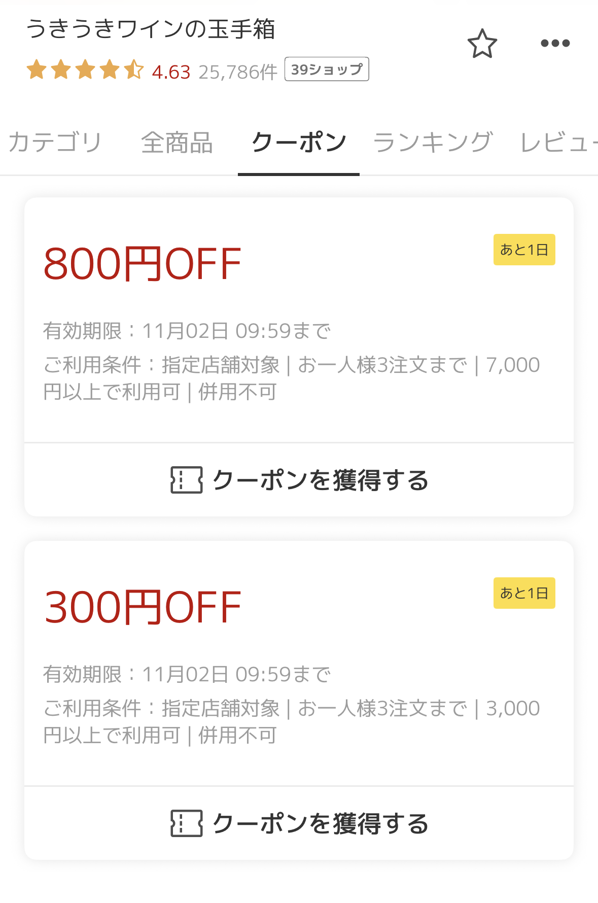 1日袋は食フェス、しかもワンダフルデーでなので当然ポイント加算もありますが、直接商品代金から割引されるクーポンはポイント以上にありがたいので、取得をお忘れなく。日付が変わって1日になると、ショップのトップページから取得できます。