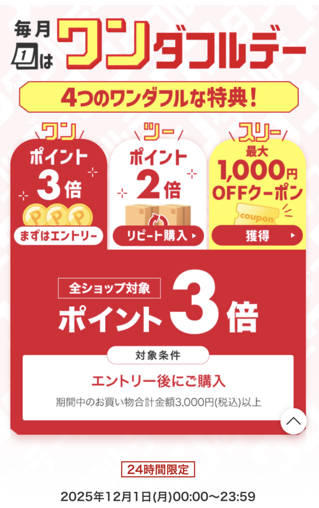 しかもワンダフルデーで、私が毎月1日に購入するように、リピート買いするとポイントが増える仕組みになっています。